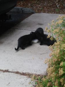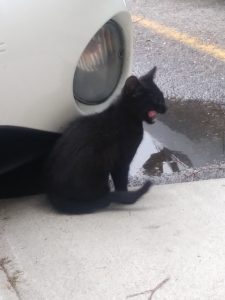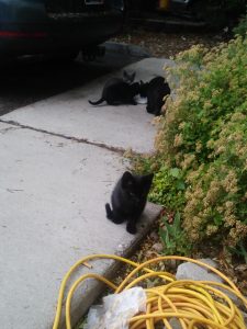 Mom and 3 kittens are black, and one grey kitten. We found them by our apartment just roaming around and they looked hungry. Trying to find the owner of the momma cat possibly or maybe someone can take them all. She is super sweet.